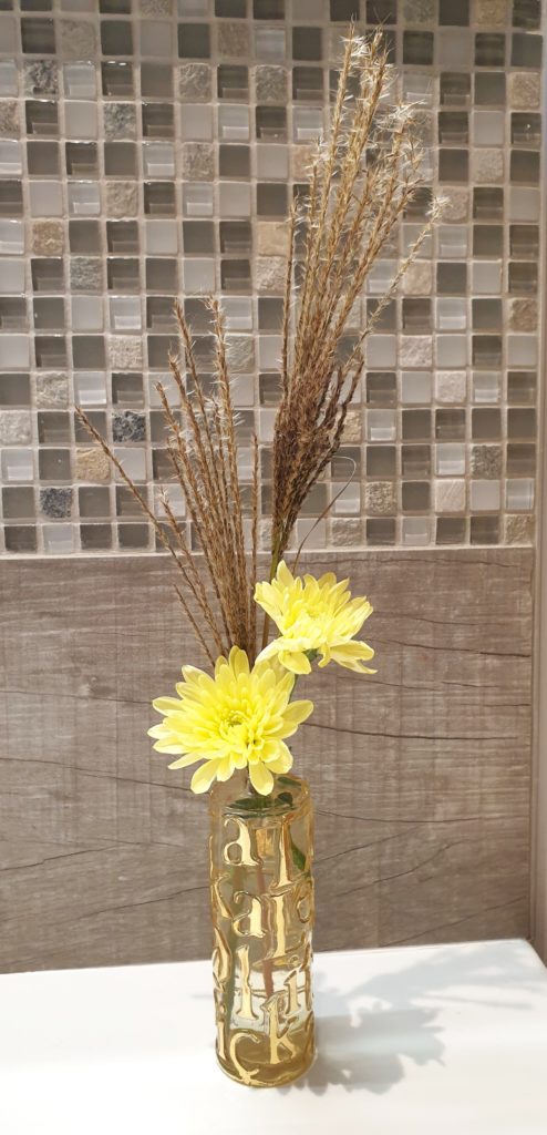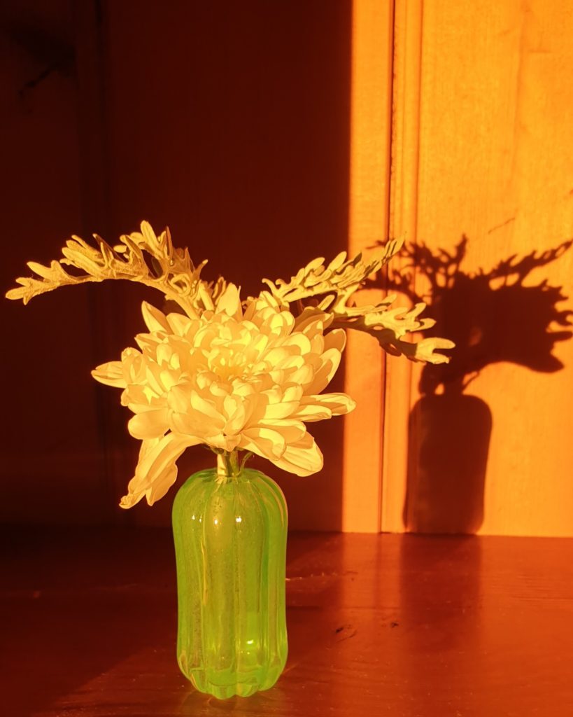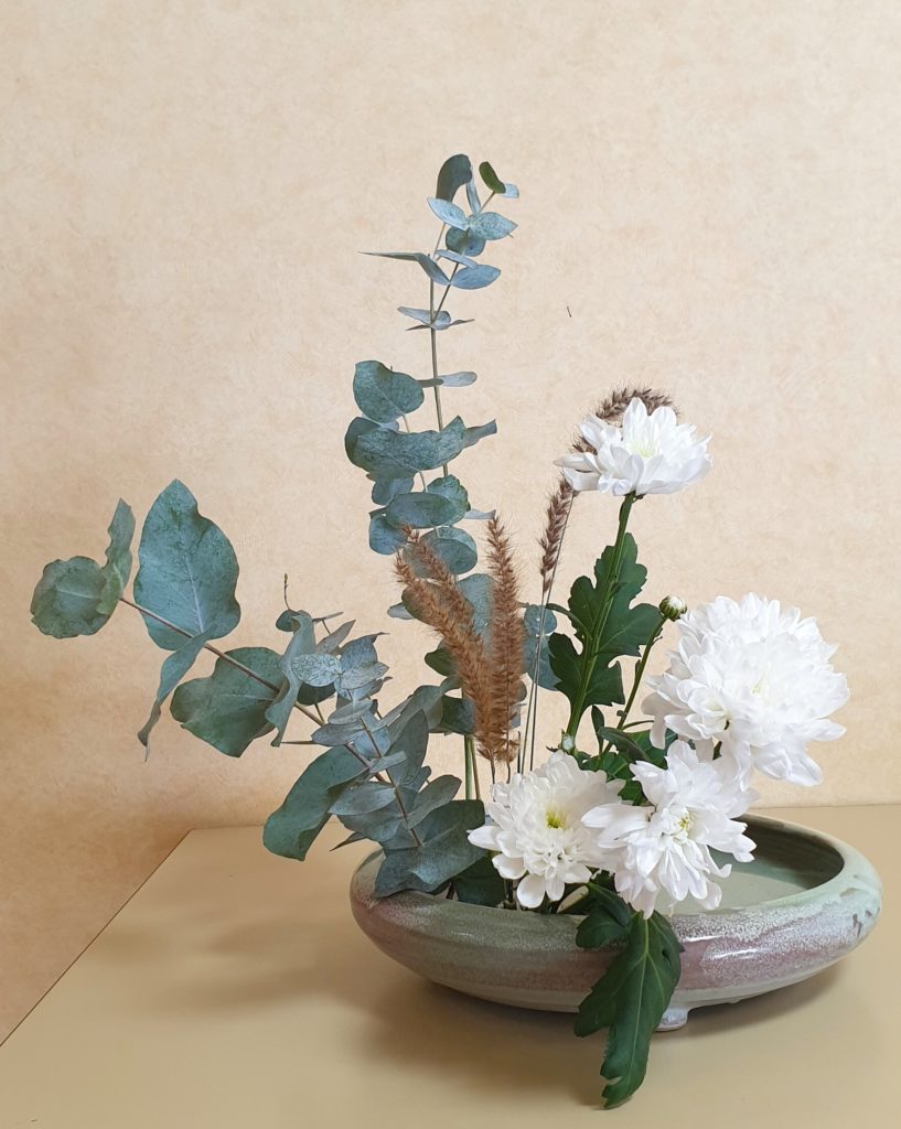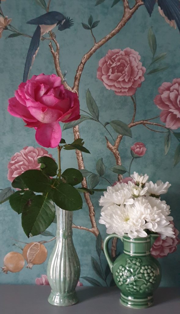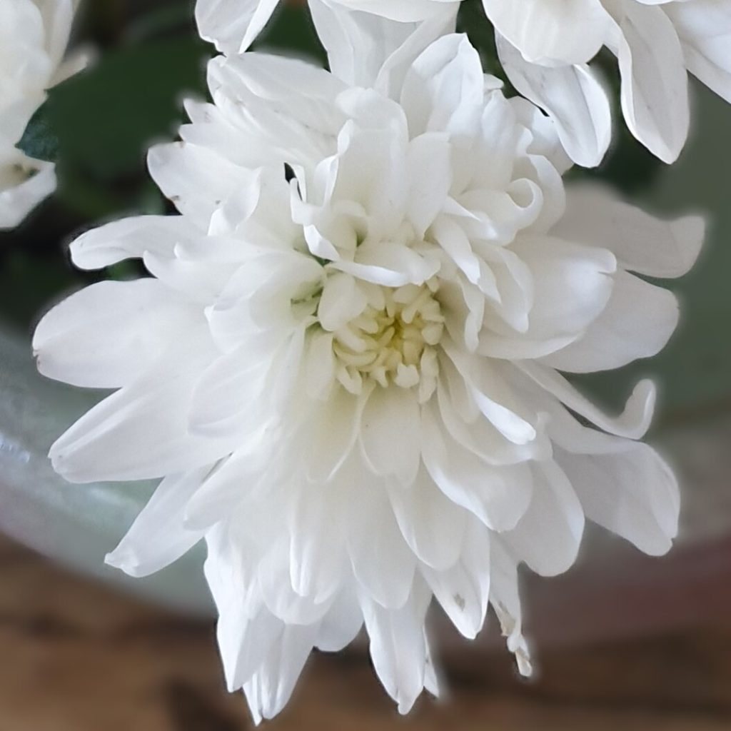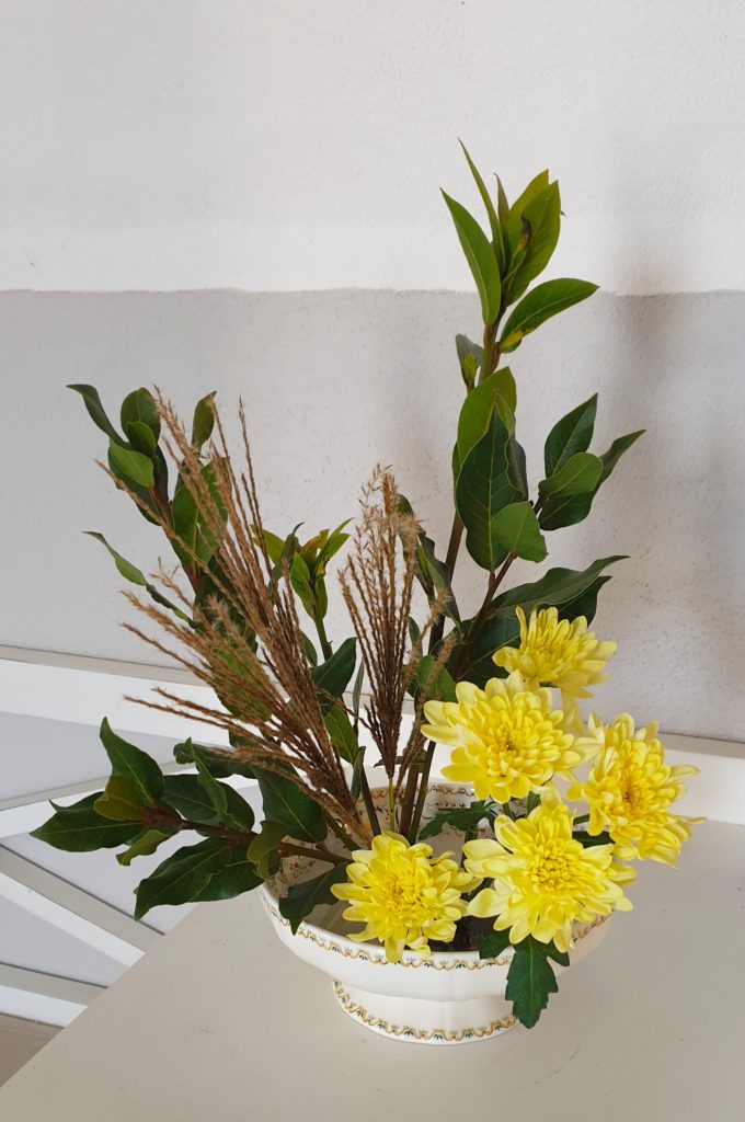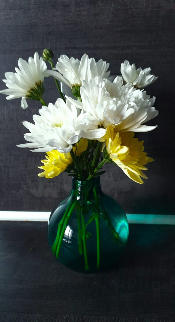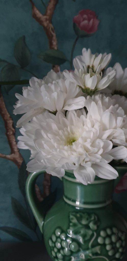 Après les premières gelées , plus de fleurs au jardin . Heureusement, le père Noël de novembre apporte les chrysanthèmes de fleuriste (Chrysanthemum) . Ces fleurs qui tiennent bien en vase nous sauvent lorsqu’on veut continuer à « bouqueter » pendant la période froide.